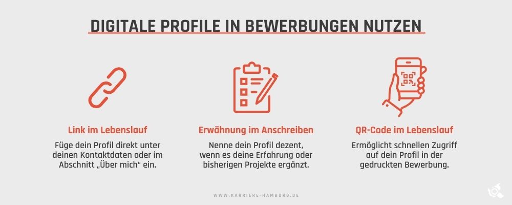 Füge zum Beispiel in deiner Bewerbung einen direkten Link zu deinem beruflichen Profil hinzu oder erwähne deine Online-Präsenz dezent im Bewerbungsschreiben. Mit einem QR-Code kannst du auch in deinem gedruckten Lebenslauf ganz einfach auf dein Profil verweisen. So vermittelst du einen modernen, professionellen Eindruck und bietest einen zusätzlichen Einblick. Weitere Tipps für deinen Lebenslauf findest du hier.